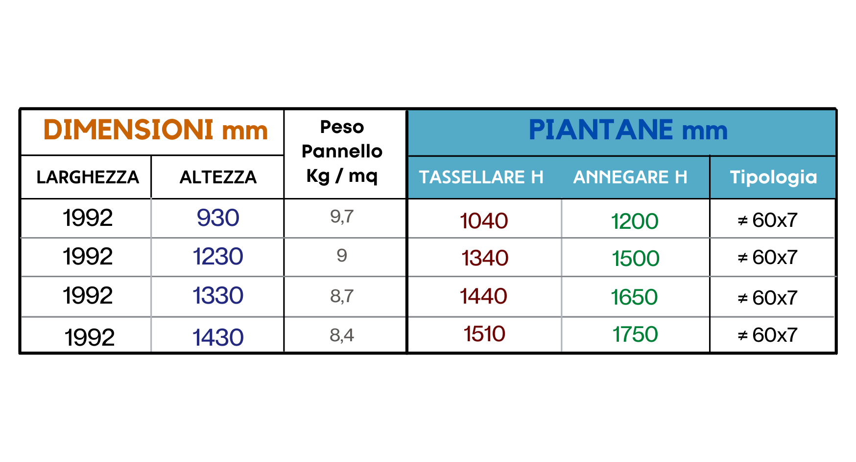 | Altezza | per pannello H 930, per pannello H 1230, per pannello H 1430 |